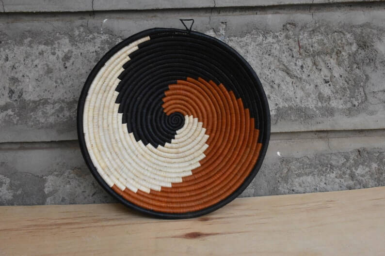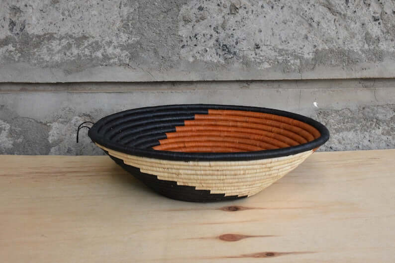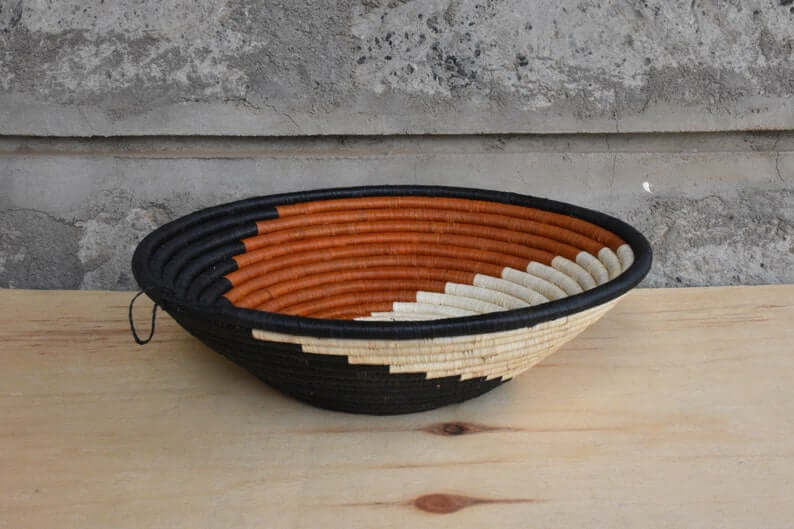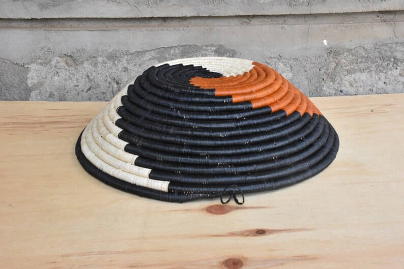 Coiling dyed raffia over banana stalks, Ugandan artisans craft these beautiful, nature-inspired baskets. These baskets are functional art that can be displayed on the wall with its raffia loop, or put to use on the tabletop, the garden, and more.